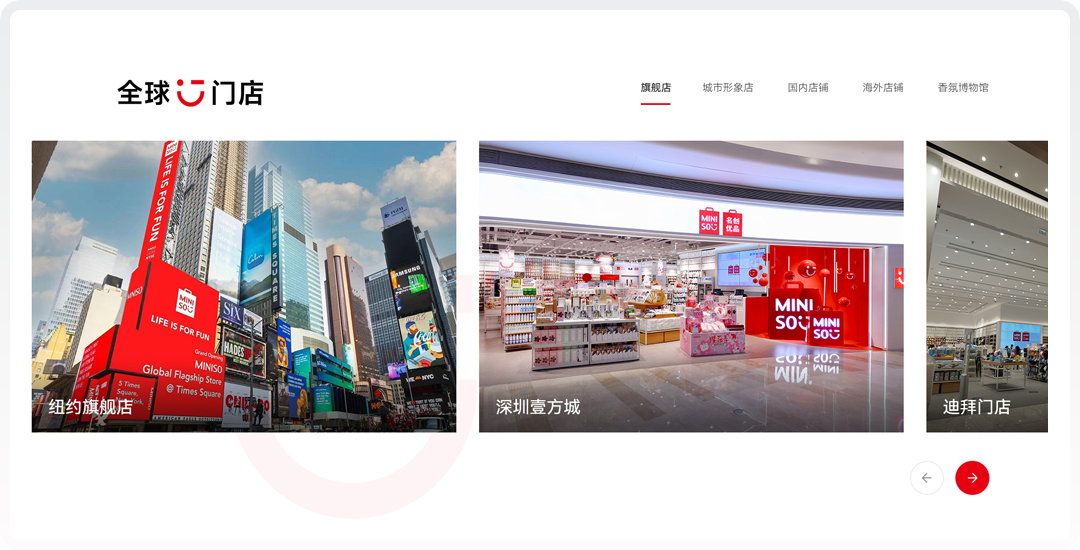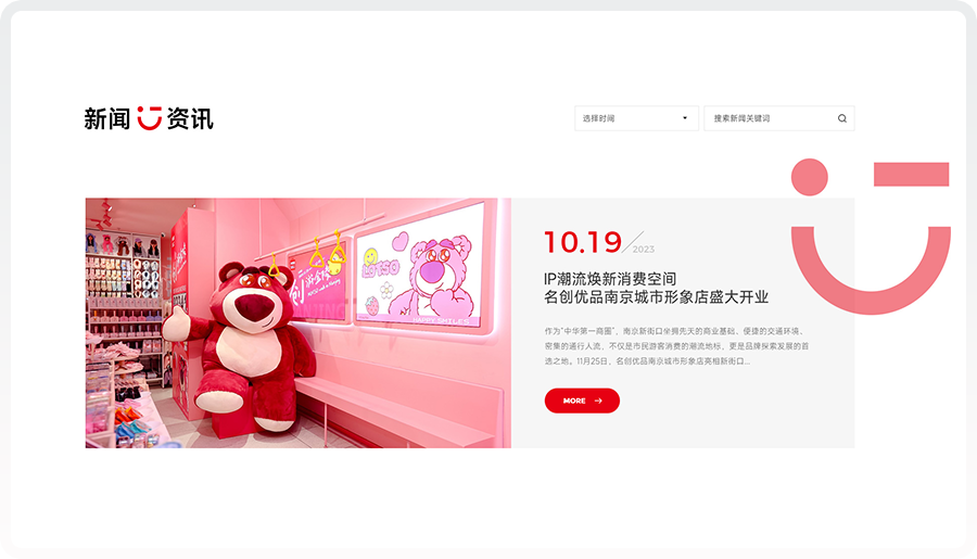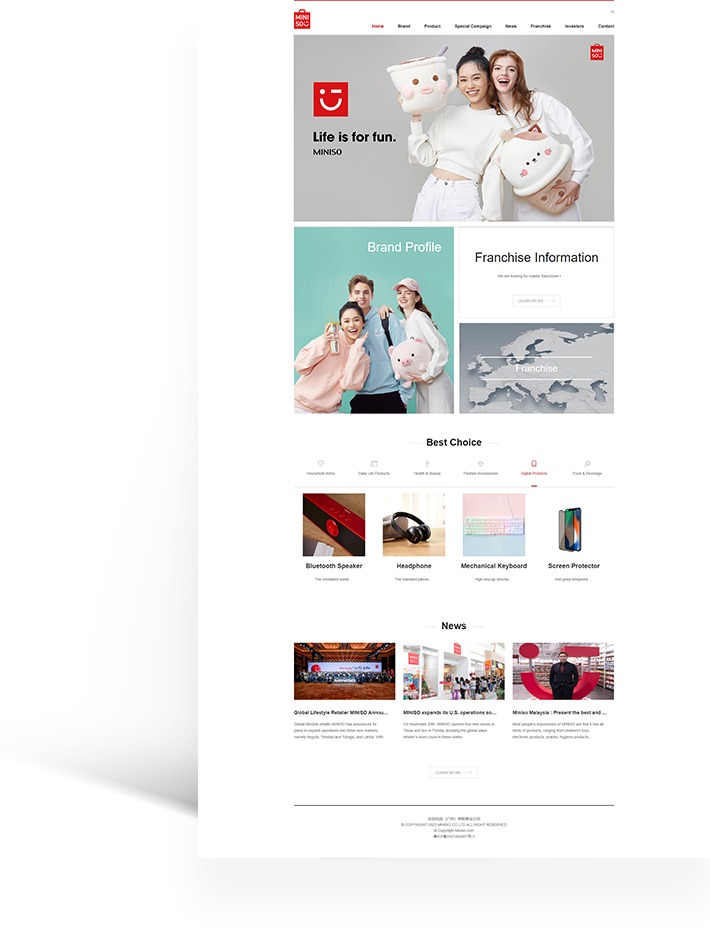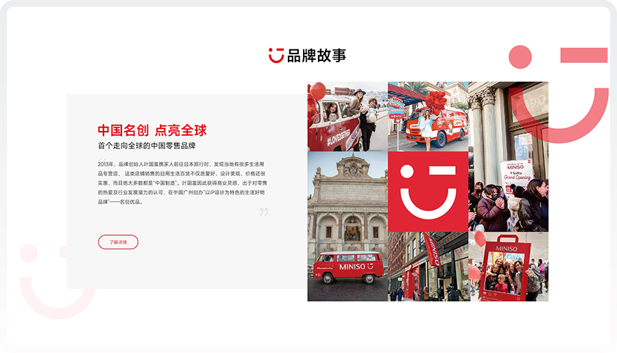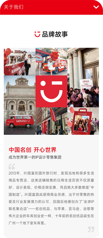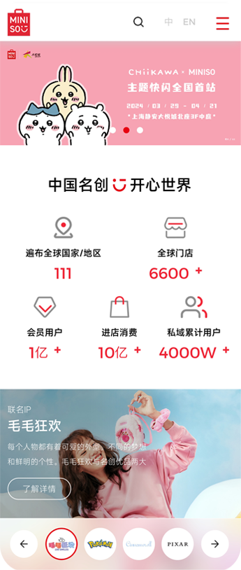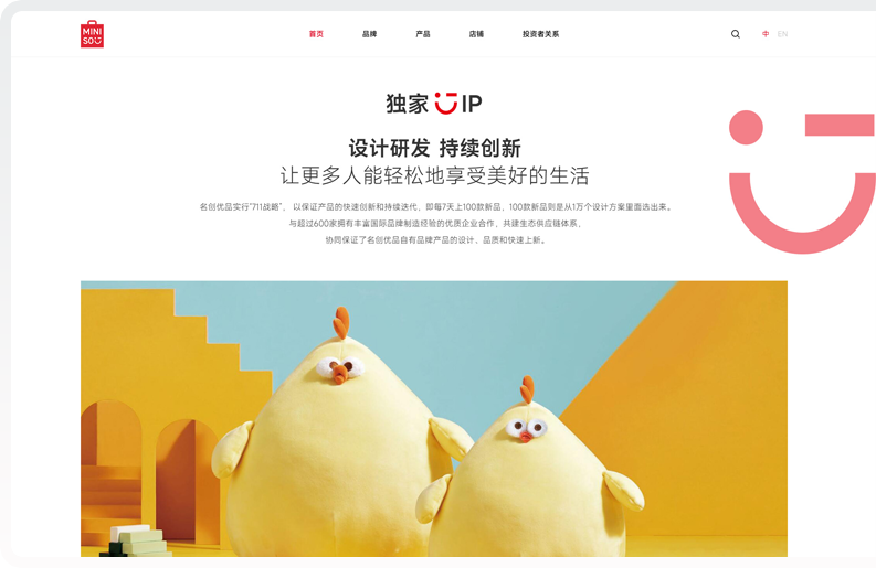 名創(chuàng)優(yōu)品,“以IP設(shè)計(jì)為特色的生活好物品牌”。發(fā)展遍布全球超105個(gè)國家和地區(qū),在全球范圍內(nèi)擁有超5400家門店。2020年正式登陸紐交所,股票代碼“MNSO”。2022年正式在香港交易所掛牌上市,股份代號(hào):“9896.HK”。2022年,名創(chuàng)優(yōu)品正式啟動(dòng)品牌升級(jí)戰(zhàn)略,推出全新品牌口號(hào)“點(diǎn)亮全球美好生活”。為了匹配新的品牌形象,體現(xiàn)全球化、時(shí)尚的元素,展現(xiàn)國際品牌定位,需升級(jí)官網(wǎng),從以前的傳統(tǒng)產(chǎn)品展示型網(wǎng)站轉(zhuǎn)換為品牌官網(wǎng),突出品牌文化、IP特色、設(shè)計(jì)實(shí)力。